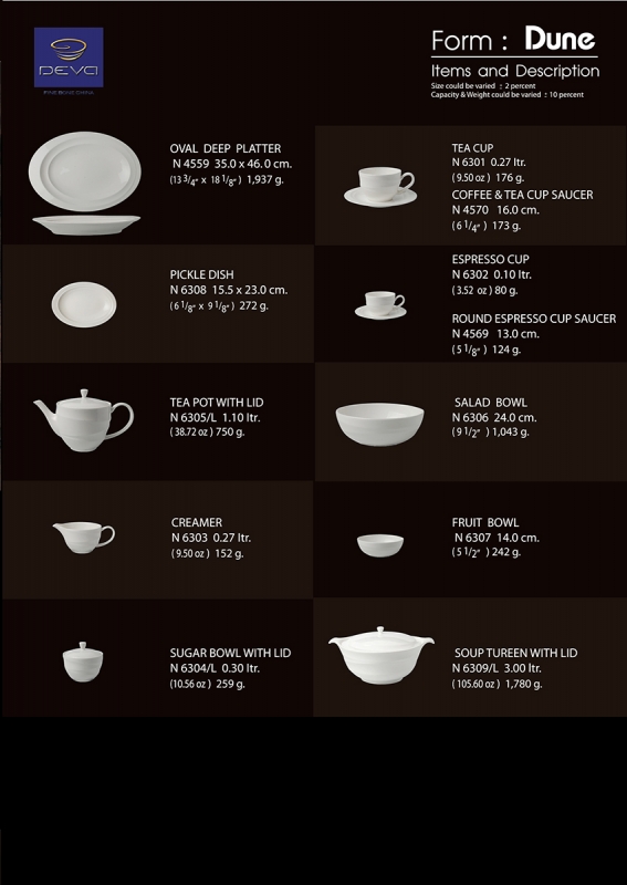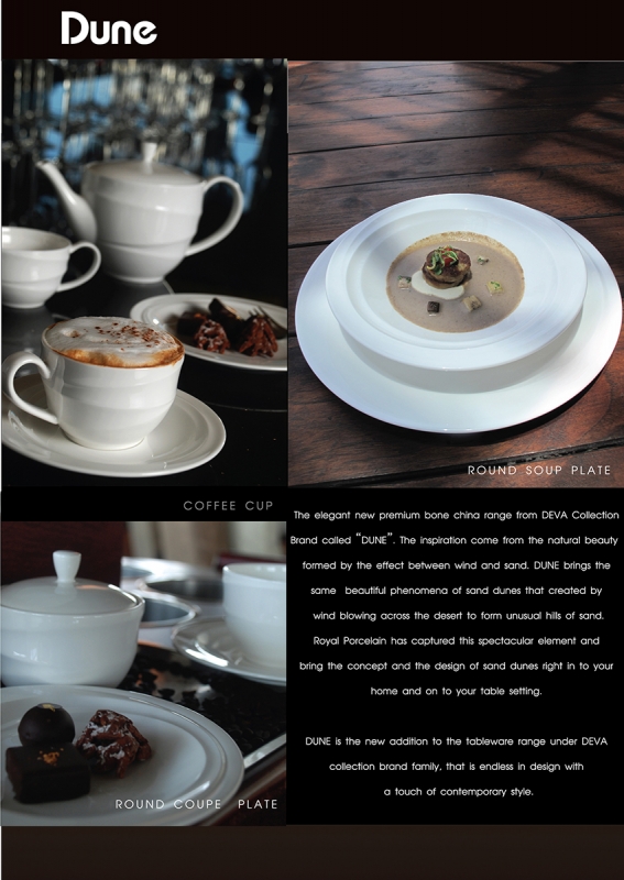 Royal Porcelain’s newest brand .DEVA is created with a new concept of tableware dining in mind. The idea is to have fun with the design but still maintains its functionality that suitable for both retail and hotel segments. DEVA signifies strength in design and pure in beauty, presenting products that create personality of being bold, unique, and fun, but at the same time elegant and sophisticate. DEVA brand is positioned in a high end/premium market segment that is suitable for 5 star hotels and restaurants |
